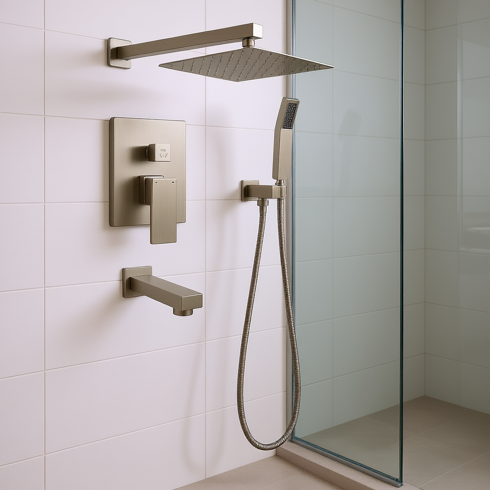 Système de douche mural en laiton de 10 pouces, finition nickel brossé, ensemble de douche moderne pour salle de bain avec douchette à main