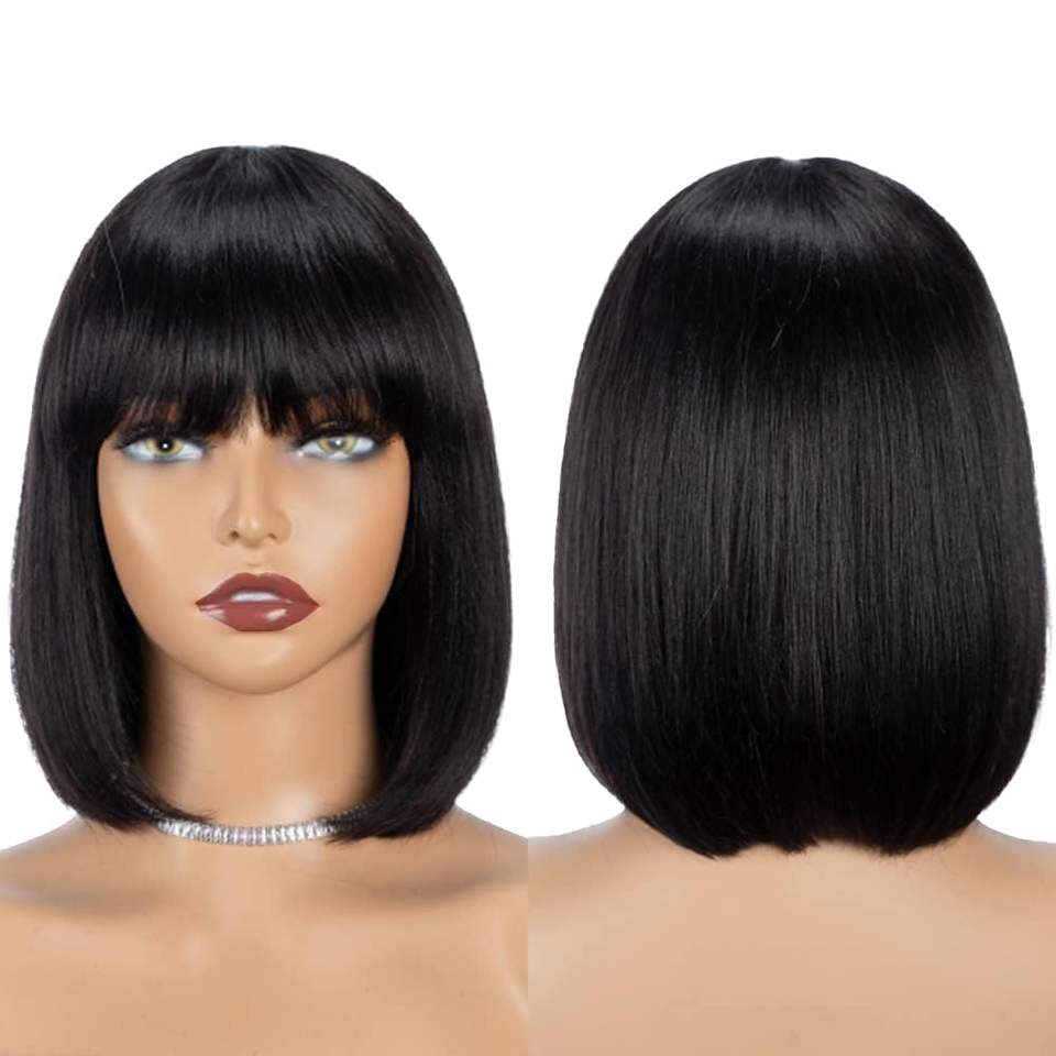 Perruque Bob courte noire de 10 pouces avec frange cheveux humains Light Yaki Straight Bang Bob perruque Wear and Go Glueless perruque pour femmes (1B)