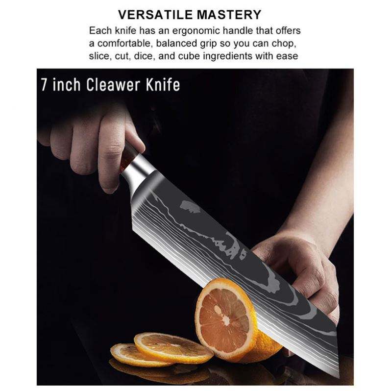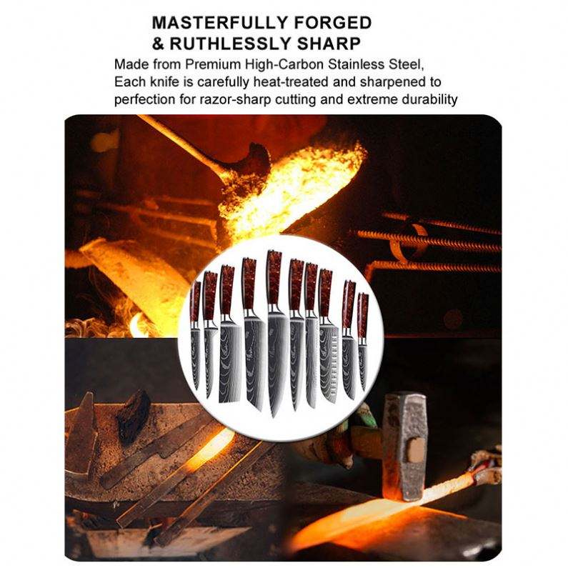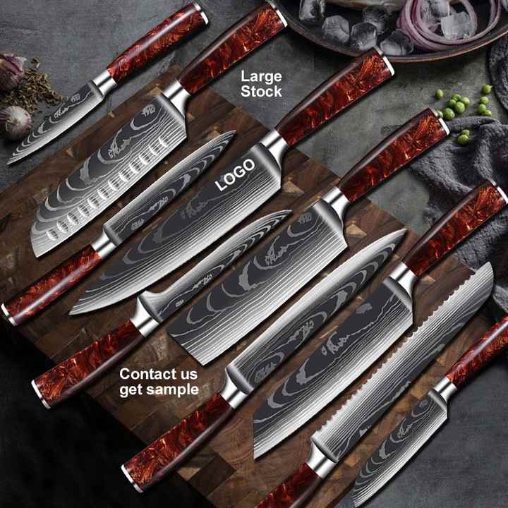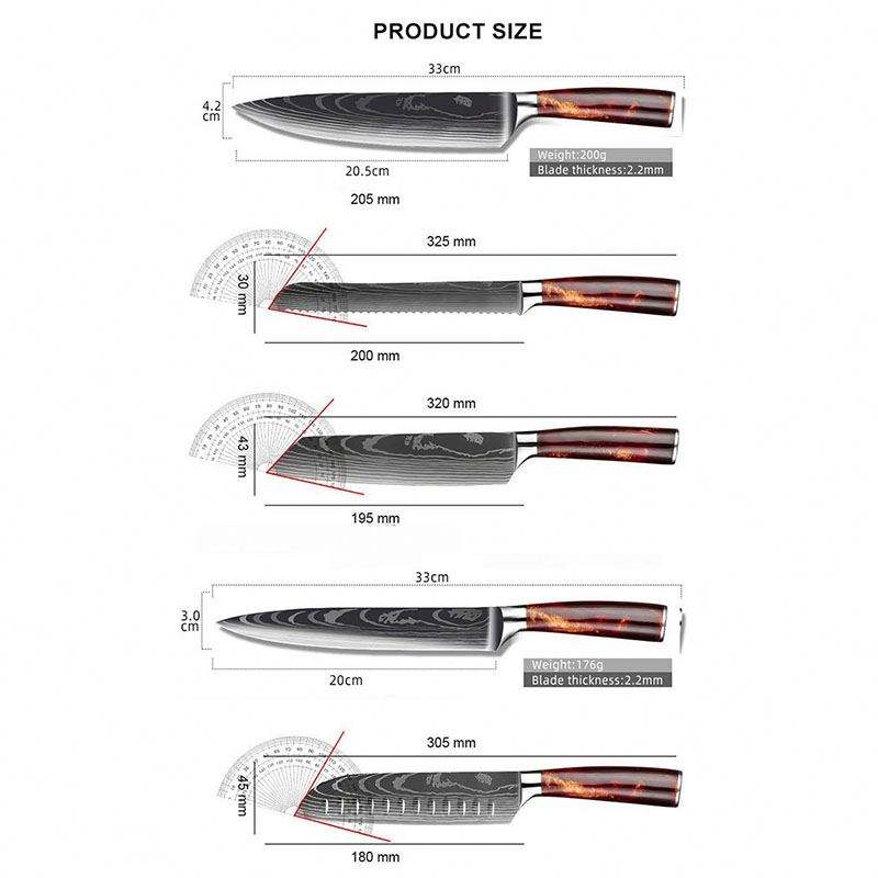 Ensemble de 10 couteaux de cuisine en résine rouge à motif Damas, style japonais, ultra-affûtés, professionnels, couteaux de chef, couteaux à pain, couteaux à éplucher