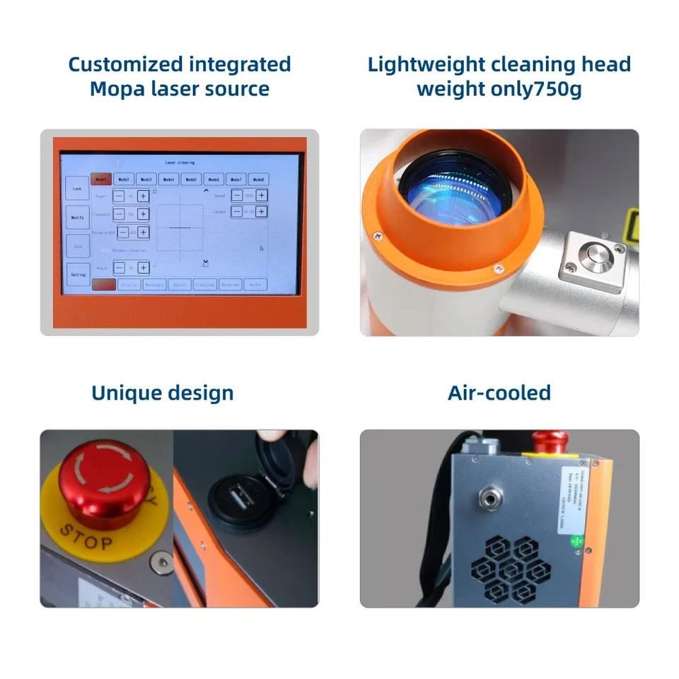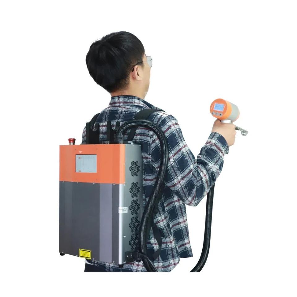 Machine de nettoyage laser pulsé portable 100W 200W 300W pour éliminer la rouille, la peinture, le sol, les murs, le métal, le bois, la pierre, avec chariot et sac à dos