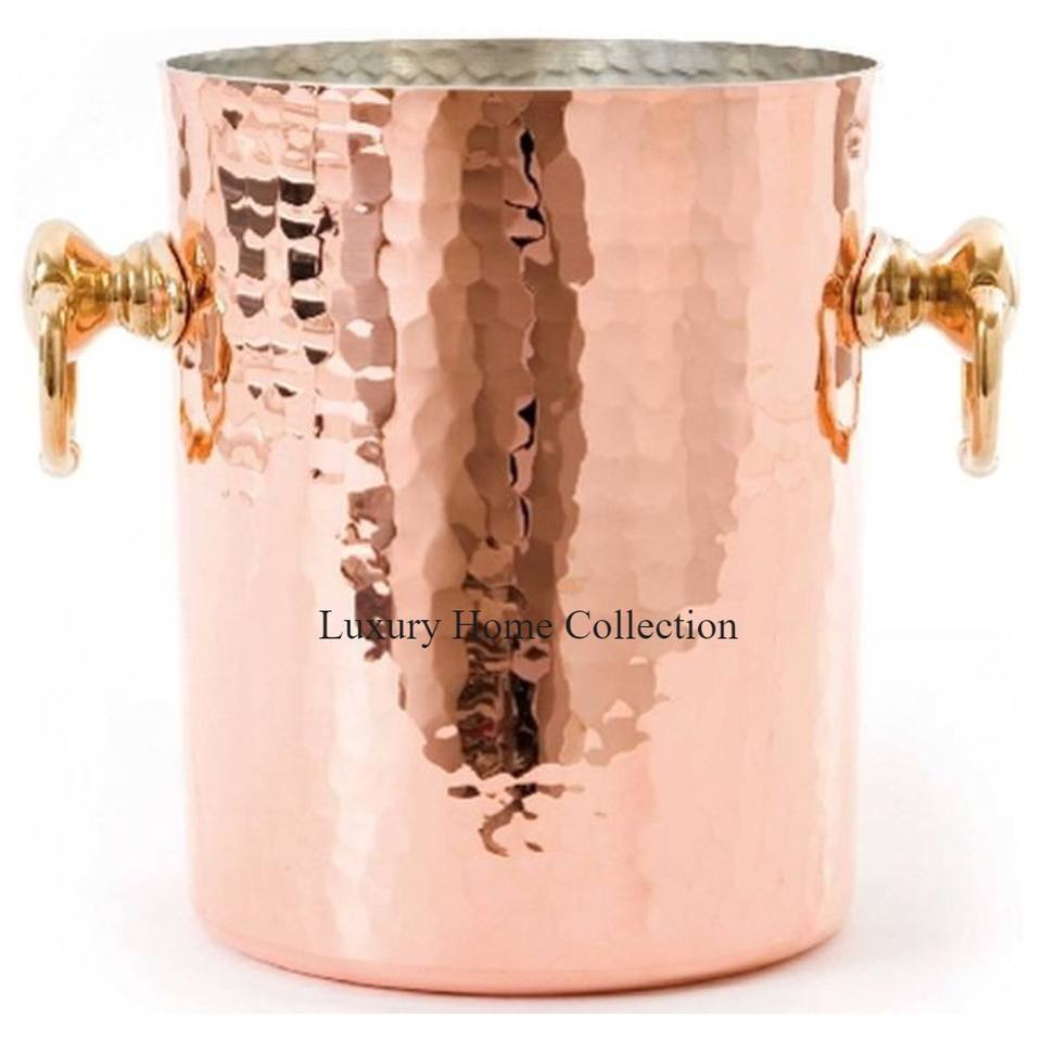 Seau à vin et à glace en cuivre 100% design martelé et forme cylindrique avec guidon de couleur or coulé en laiton et fournitures de fête