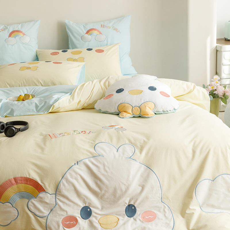 100% Cotton Applique Embroidery 4-Piece Bedding Set, Children's 100% Cotton Fresh and Minimalist Bedding Sets, Skin-Friendly