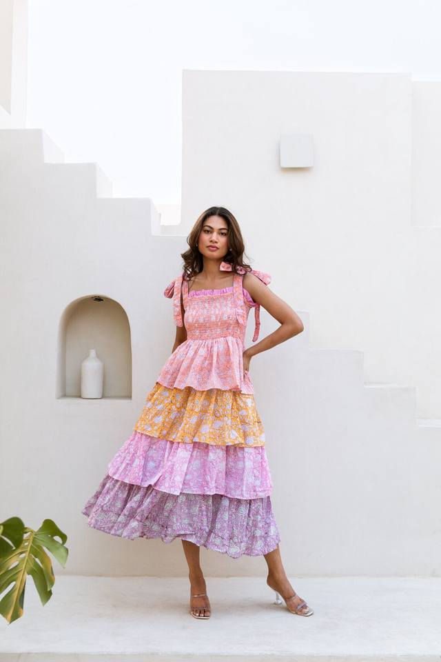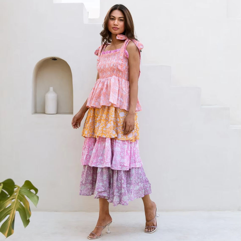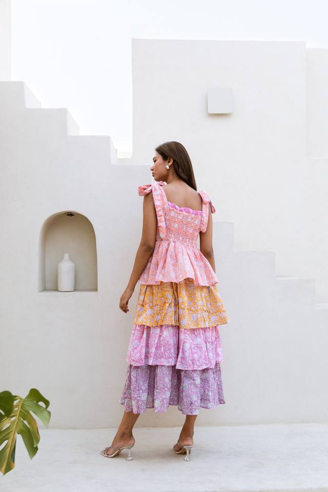 100% Cotton Hand Block Printed Maxi Dress Vintage Pastel Wedding Guest Sun Dress Solid Back Tiered Colors Artisan Made-Size 6XL