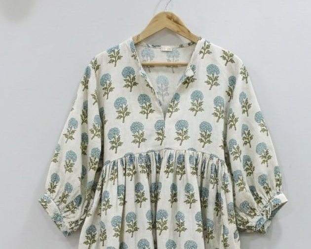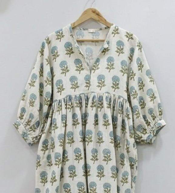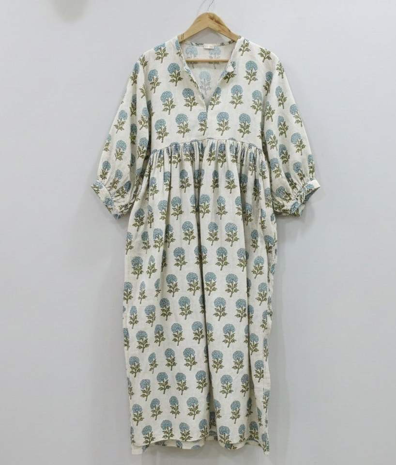 Robe d'été formelle simple 100 % coton faite à la main, écologique, motif floral imprimé au bloc indien, respirante, taille naturelle, longueur midi