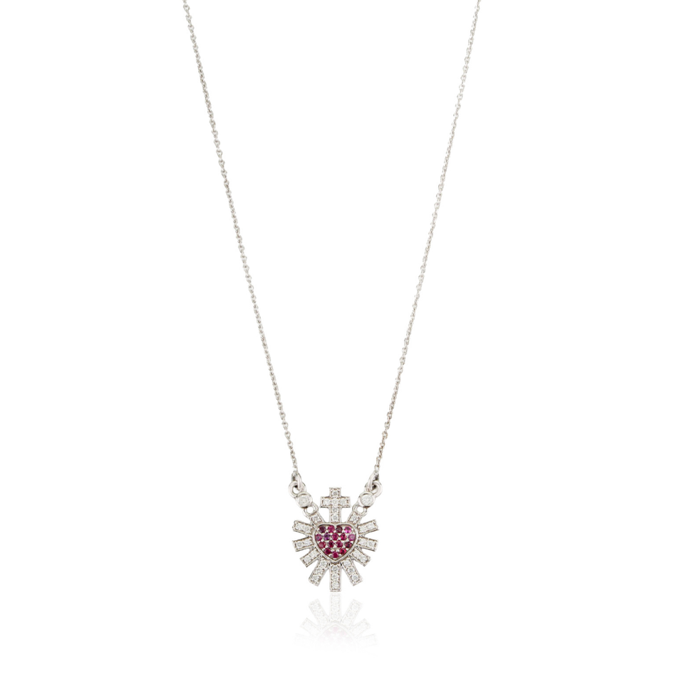 Collier pendentif Cœur Sacré soleil éclatant en or blanc 14 carats, serti de rubis et de diamants, fait main, design le plus récent, 100% authentique