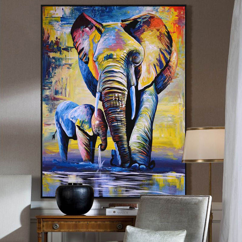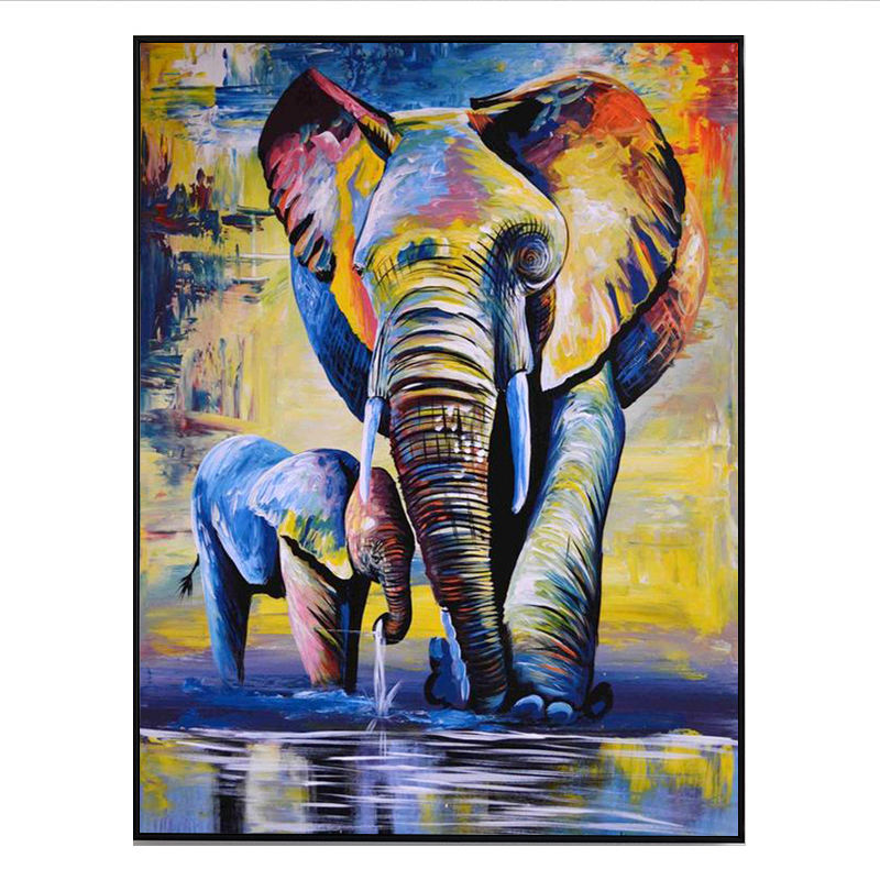 Peinture à l'huile murale 100% peinte à la main, grand et petit éléphant jouant dans l'eau, décoration colorée, 2 éléphants