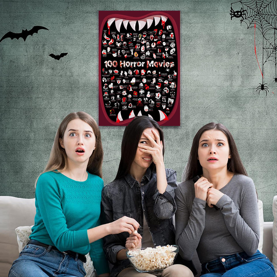 Affiche à gratter de 100 films d'horreur avec outil de grattage, collection de liste de films à voir, cadeaux de films d'horreur d'Halloween, encre fluorescente