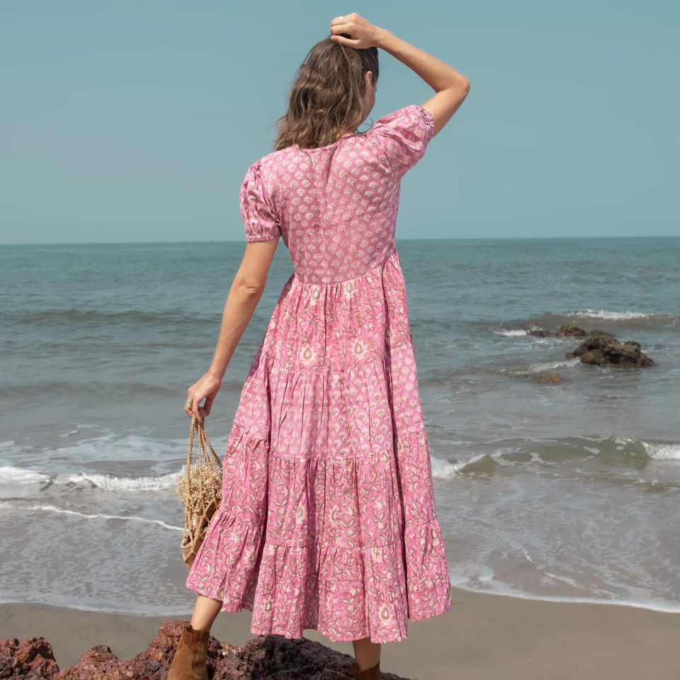 100% coton biologique main bloc imprimer femmes robe coton robe robe d'été floral boho plage Maxi tenue