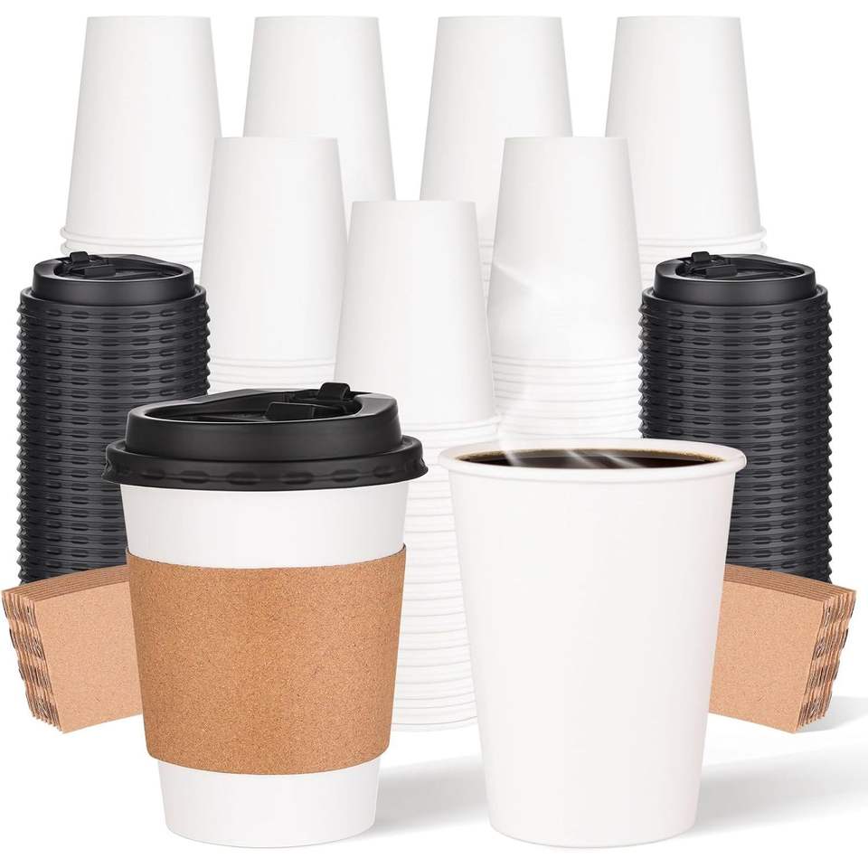 Lot de 100 gobelets en papier jetables de 12 oz avec couvercles et manchons pour café, chocolat chaud, thé, jus – Idéal pour les boissons à emporter