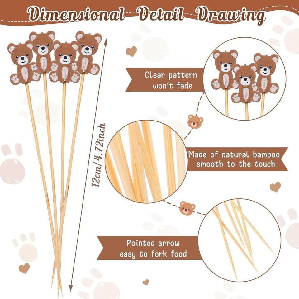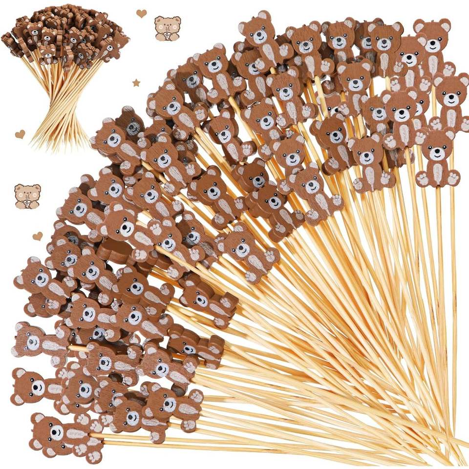 100 pics à cocktail en bambou de 4,7 pouces en forme d'ours pour apéritifs, décorations de fête, présentation de fruits