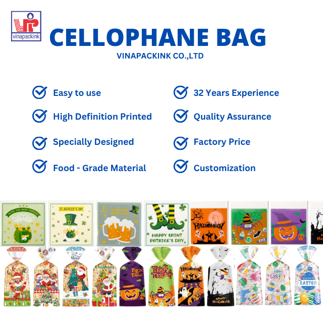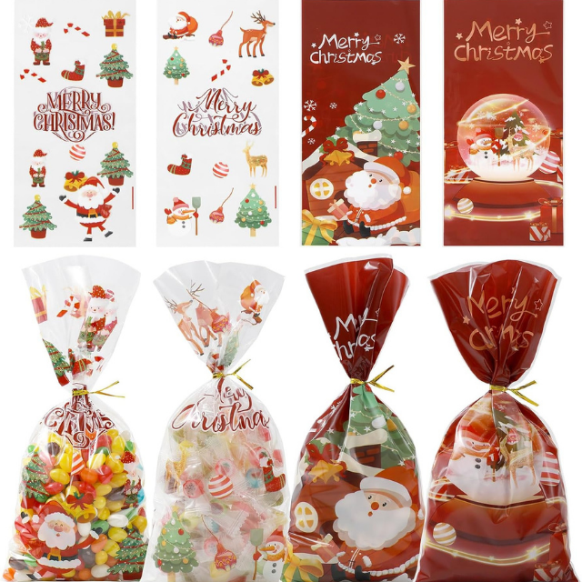100 pièces par lot, nouveaux sacs cadeaux biodégradables pour bonbons et biscuits de Noël, 4 styles, cellophane, marque Vinapackink, fête, vacances