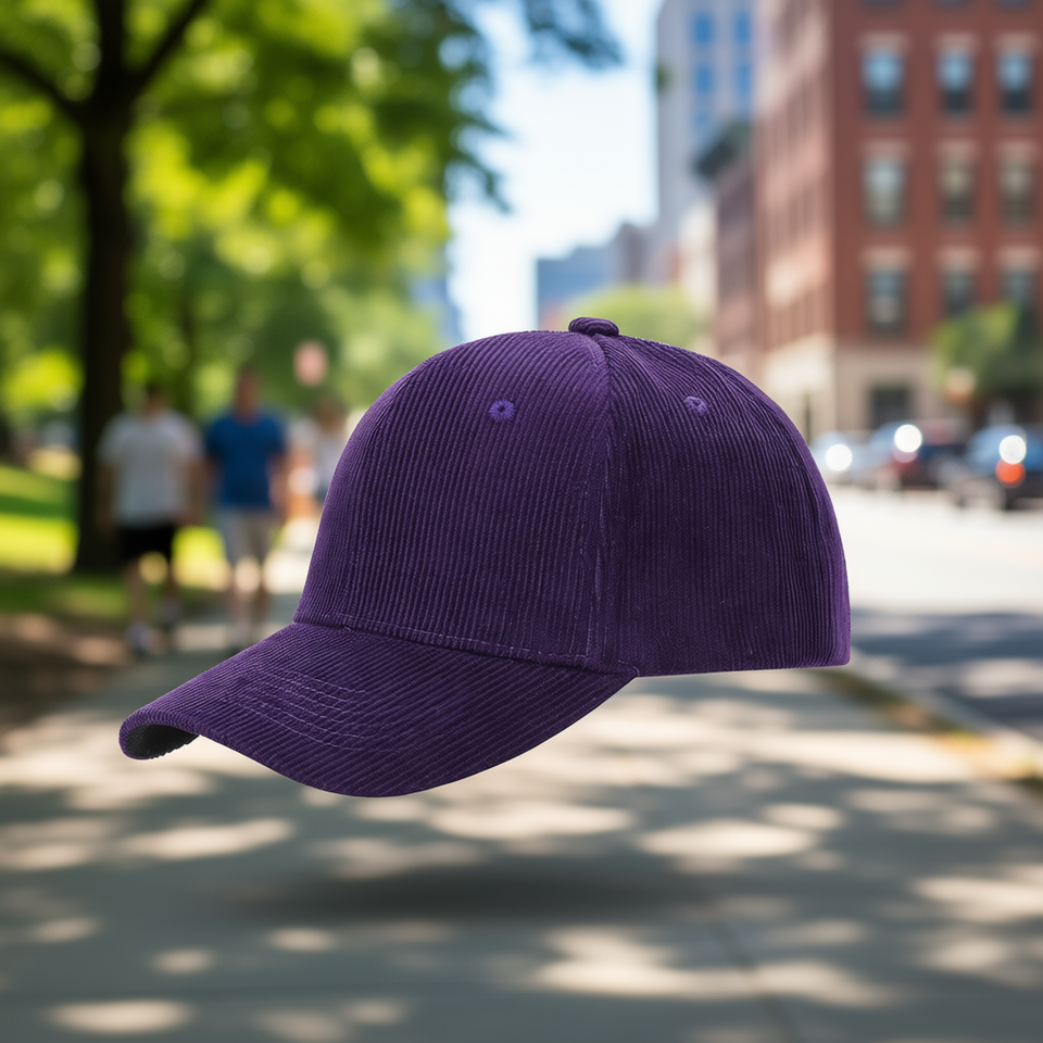Casquette de baseball 5 panneaux en velours côtelé violet, fermeture à boucle réglable, unisexe, style sportif décontracté, toutes saisons, couleur unie, taille adulte