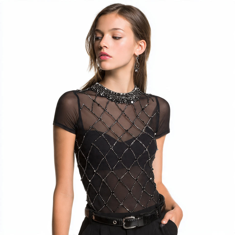 T-shirt en maille transparente 100 % polyester avec strass pour femme – T-shirts décontractés en maille à strass pour femme