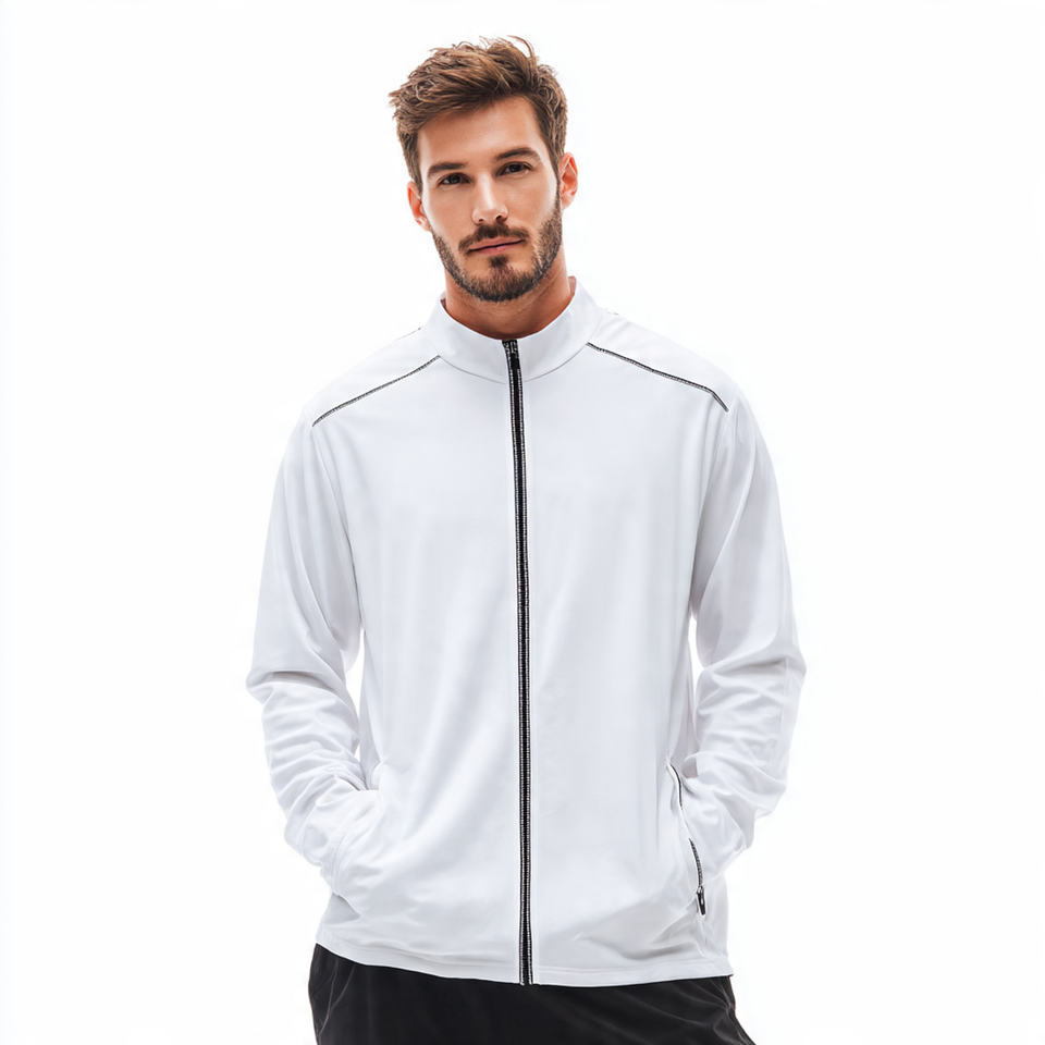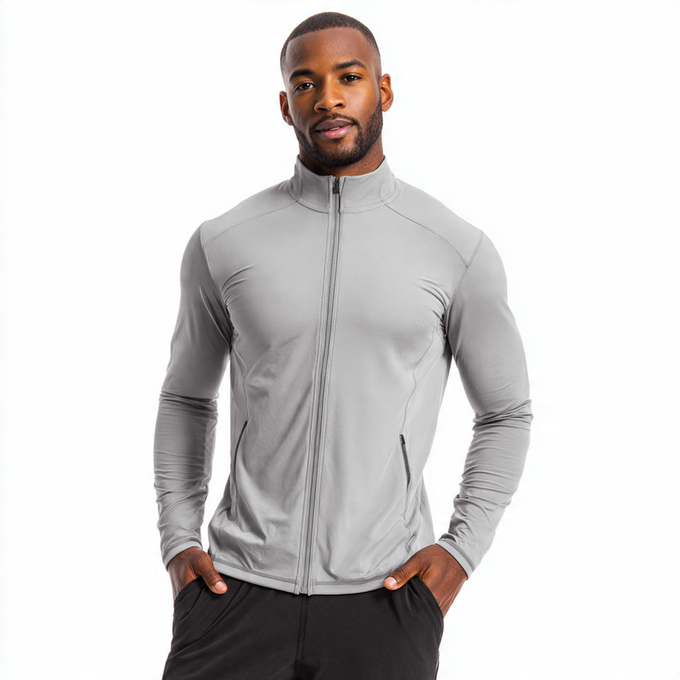 Veste de yoga pour homme 100 % polyester à col montant, style urbain, pour la gym et le fitness, anti-UV, coupe-vent, respirante, fermeture frontale