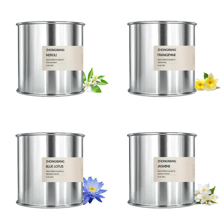 Huile de néroli, huile de jasmin, huile de lotus bleu, huile de frangipanier