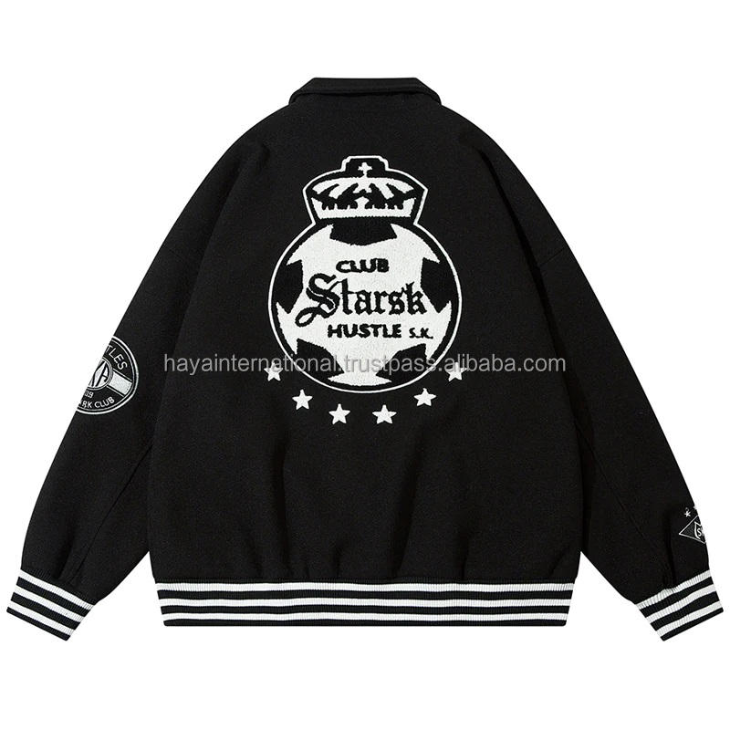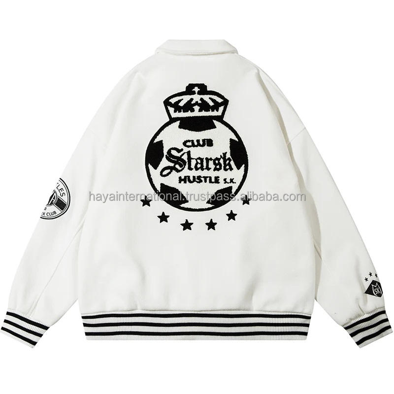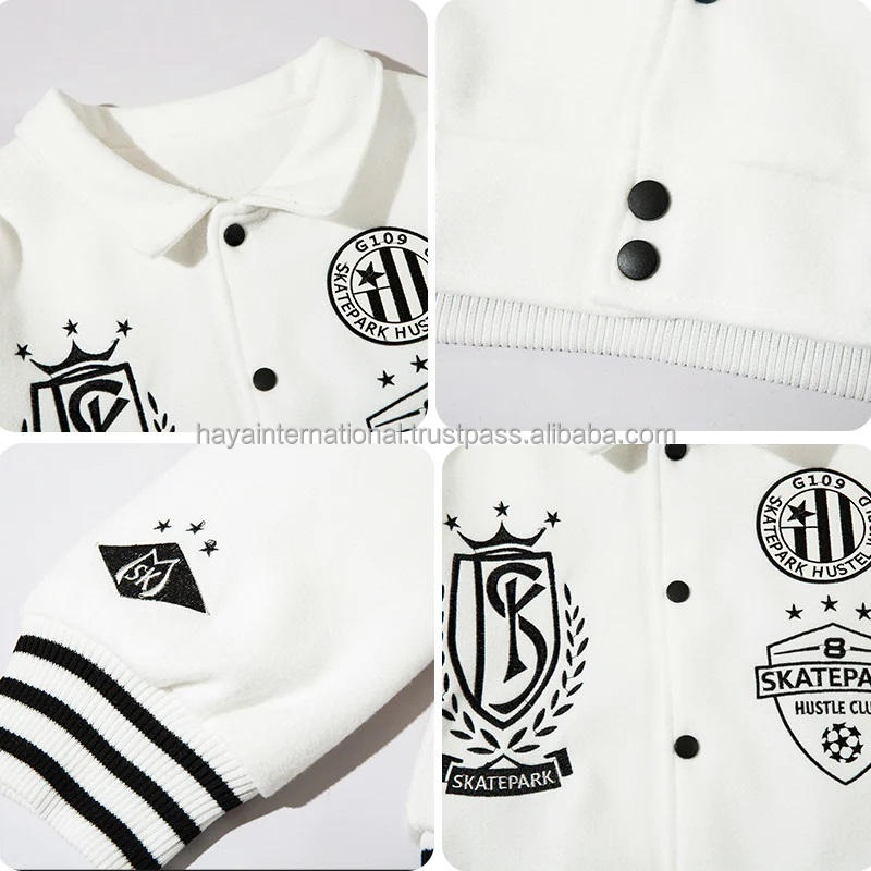 Blouson universitaire unisexe 100 % pure laine écologique pour l'hiver, broderie personnalisée, haute qualité, col montant blanc, logo frontal sur le corps