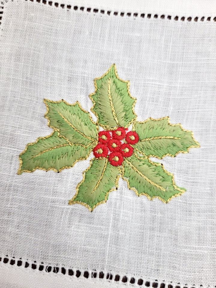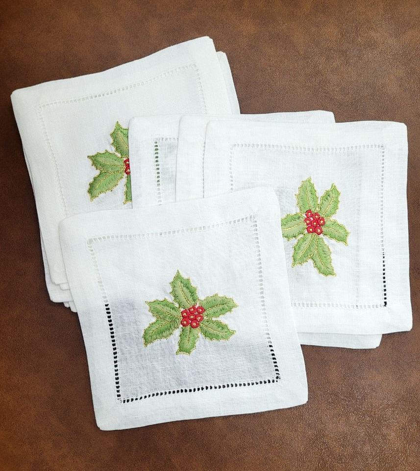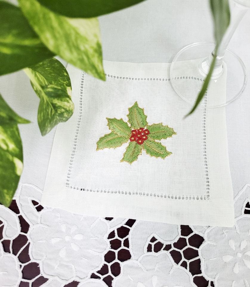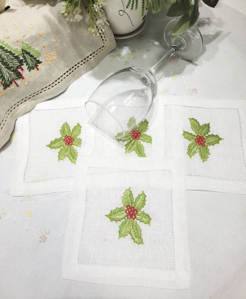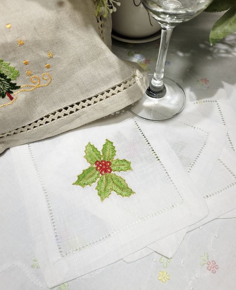 Serviette de cocktail en lin blanc 100% faite à la main avec un motif de congé de houx de Noël brodé pour les événements de l'hôtel ou du bar à la maison