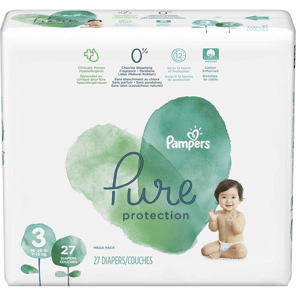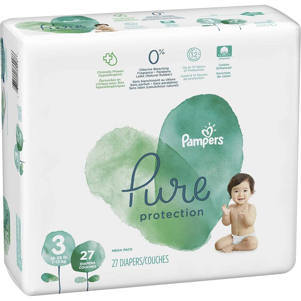 Lot de 27 couches 100 % protection pure, taille 3, hypoallergéniques, non parfumées, en coton tissé uni, pour bébés de 7,2 à 12,7 kg