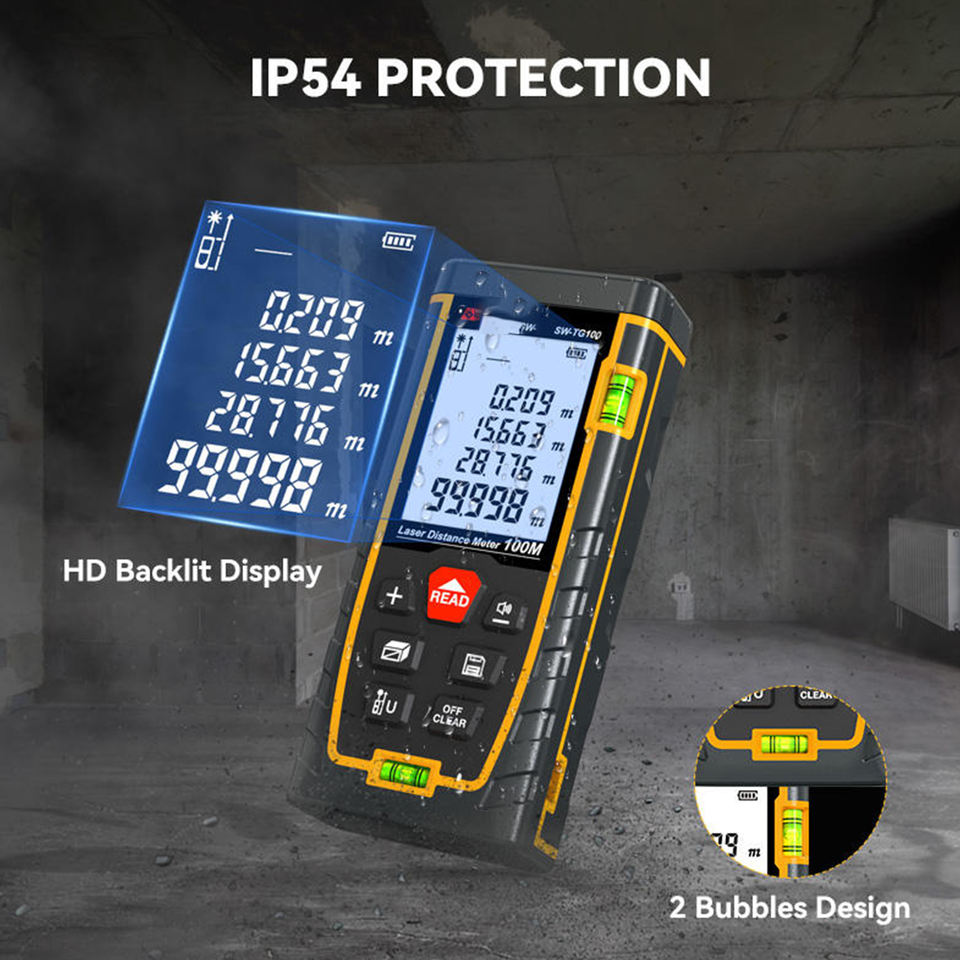 Télémètre laser 100 m avec écran rétroéclairé HD, étanche IP54, outil de mesure numérique, mémoire de 100 groupes de données