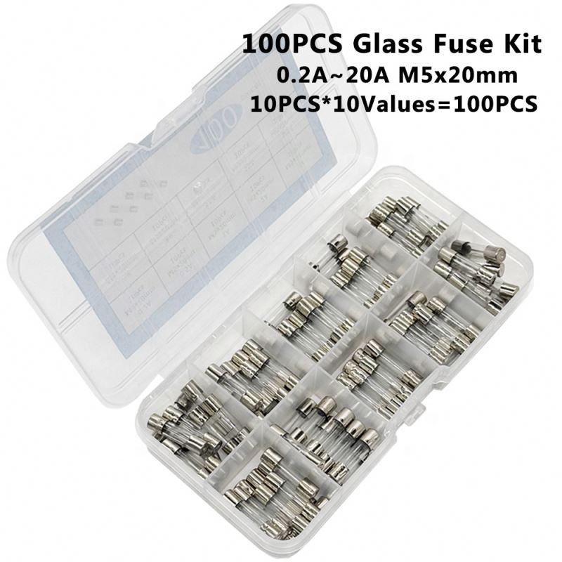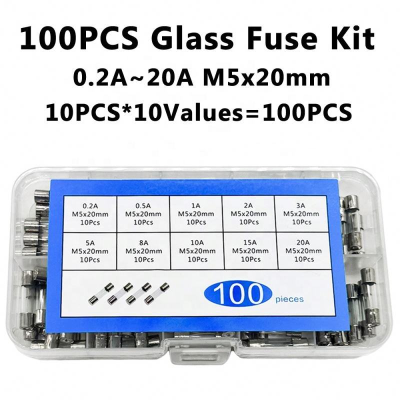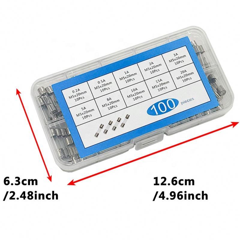 Kit de 100 fusibles rapides en verre M5x20 mm 250 V 0.1 0.2 0.25 0.5 1 1.5 2 3 4 5 8 10 12 15 20 A dans une boîte en plastique transparent