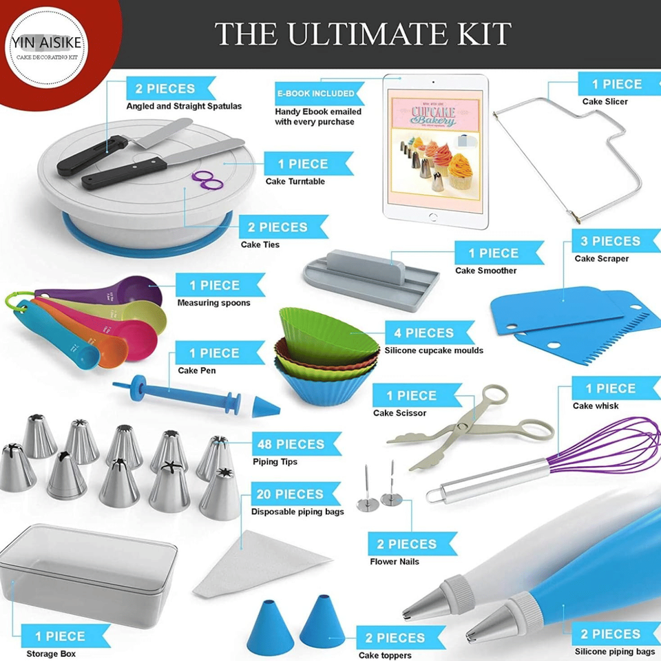 Kit de 100 pièces pour la décoration de gâteaux : 48 douilles à pâtisserie, 20 poches à douille jetables, 2 raccords, 1 plateau tournant pour gâteaux
