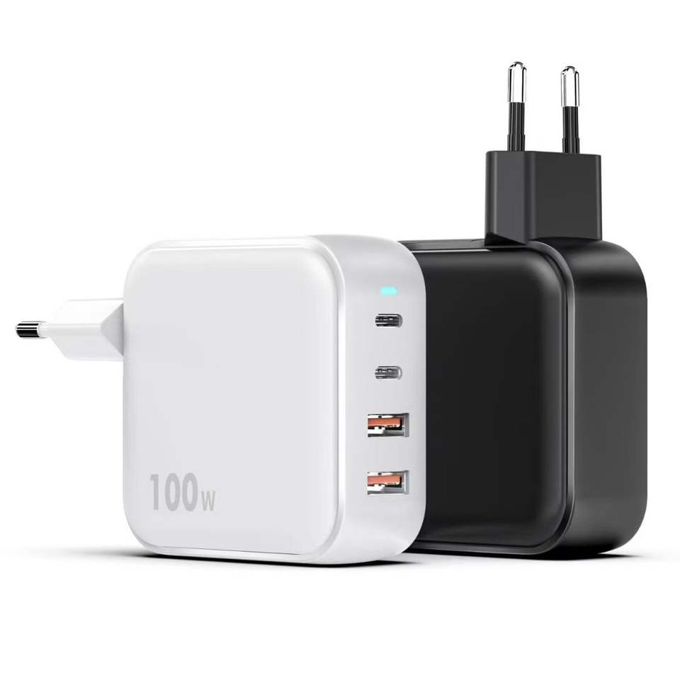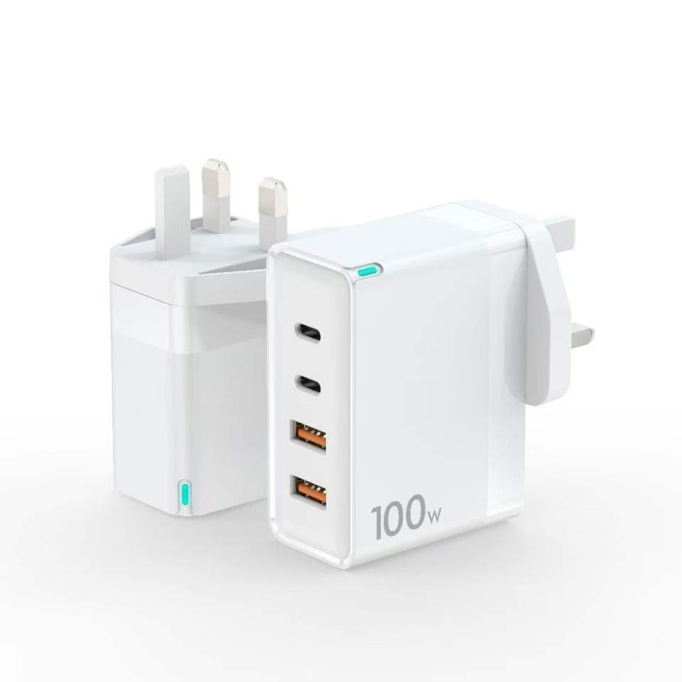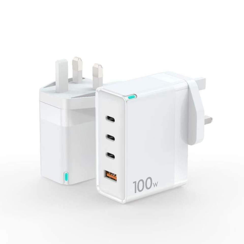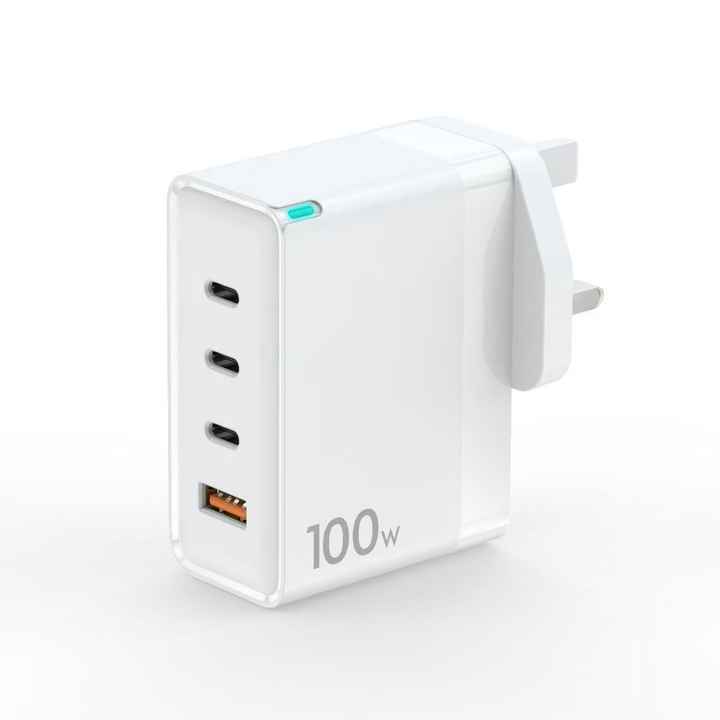 Chargeur mural GaN 100W Adaptateur secteur à USB-C rapide 4 ports Prise britannique 3C1A Compatible Mac Book/Laptop QC2.0 Fonctions SCP Sortie 55W