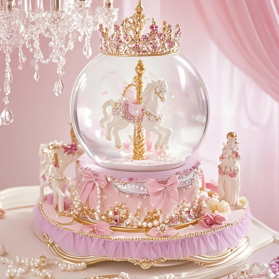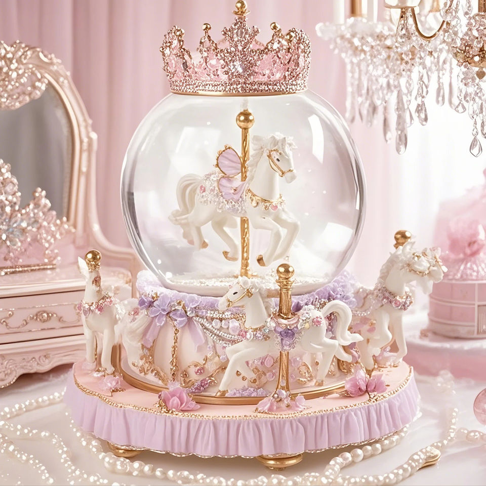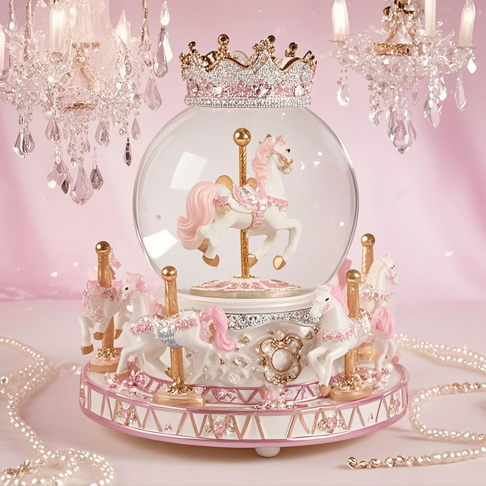 Boule de cristal de boîte à musique carrousel rotatif de 100mm avec chute de neige et mélodie automatique, cadeau de rêve pour les anniversaires/le nouvel an