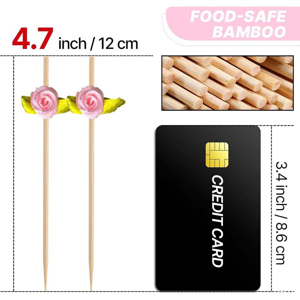 100 pièces de pics à cocktail en bambou de 4,7 pouces, pics à dents fantaisie en forme de rose rose pour apéritifs, nourriture, boissons, fruits
