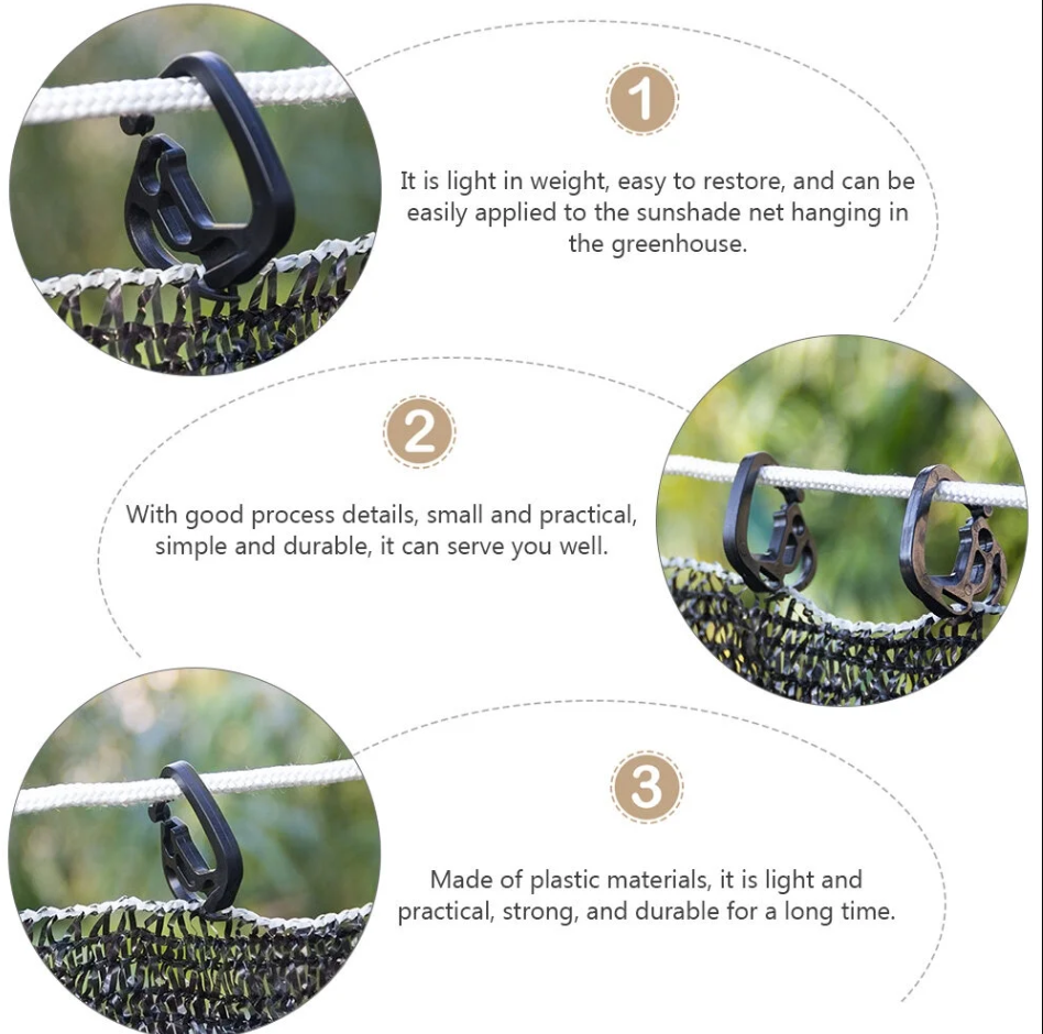 100 clips robustes pour filet d'ombrage, crochets en plastique noir pour bâche de jardin, pour suspendre et fixer des tentures d'ombrage extérieures et des toiles de jardinage