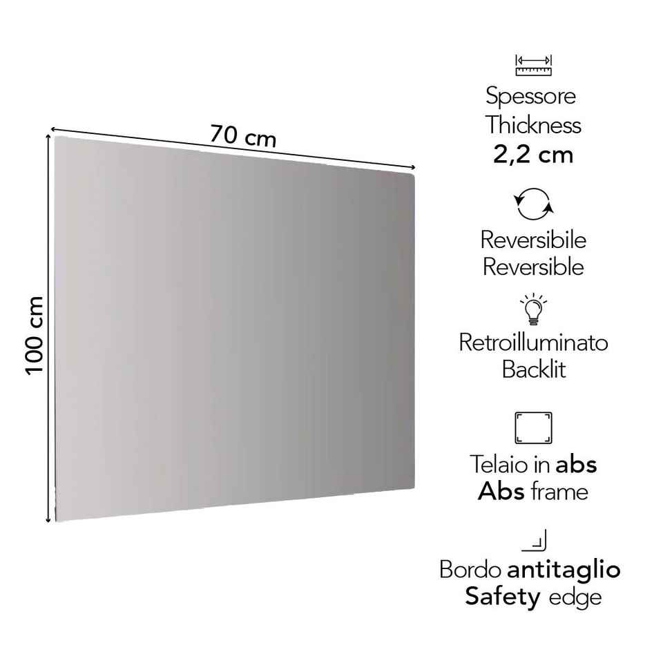 Miroir de salle de bain LED 100x70 cm avec éclairage périmétrique, cadre en aluminium mural, résistant à l'eau, qualité supérieure