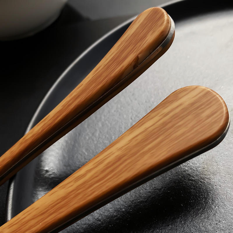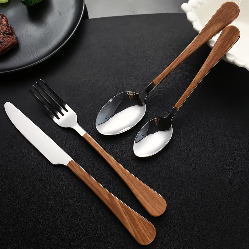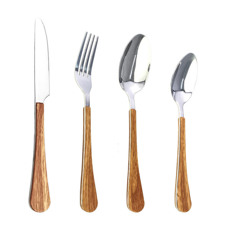 Ensemble de couteaux et fourchettes en acier inoxydable 1010, 4 pièces, bord dentelé, lame polie, manche imitation bois, vaisselle occidentale