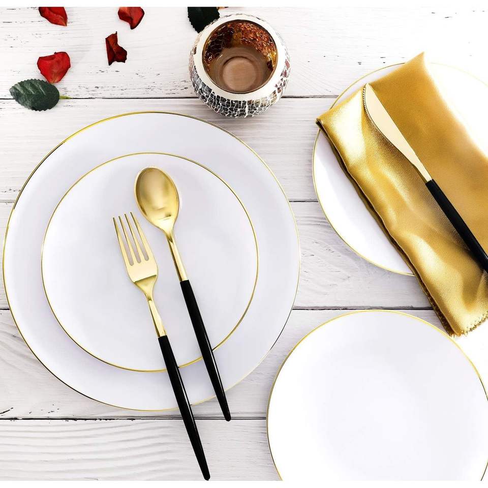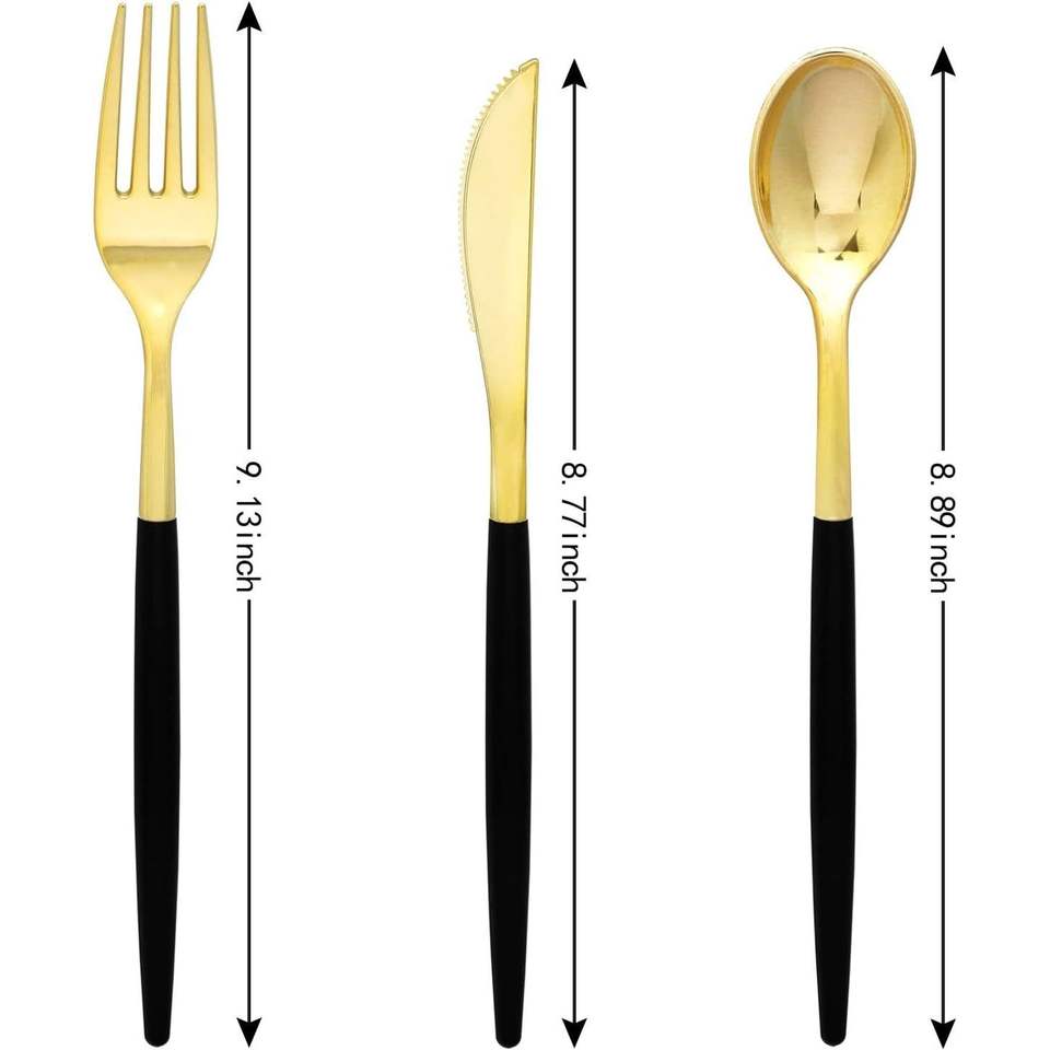 102PCS Gold Plastic Cutlery with Black Handle