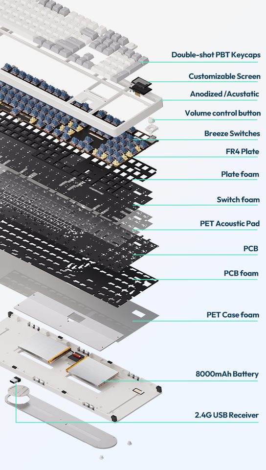 Clavier de bureau sans fil 104% pleine taille, clavier de jeu RVB avec fonction de calcul d'écran