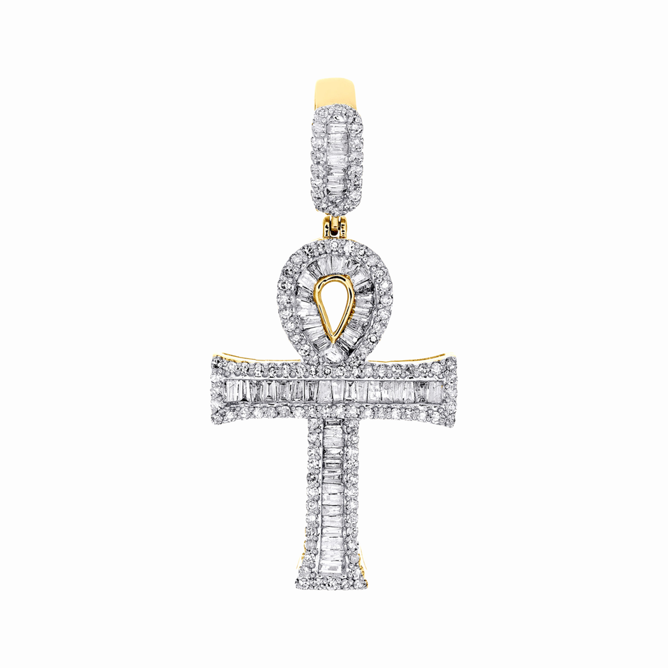 Pendentif Croix Ankh Égyptienne en Or Jaune Massif 10K avec Diamants Baguette Sertis en Canal, Breloque de 1,5 po, 0,87 CT, Bijoux Hip Hop pour Homme