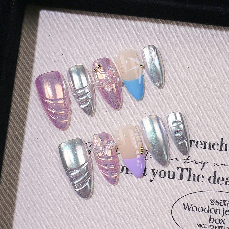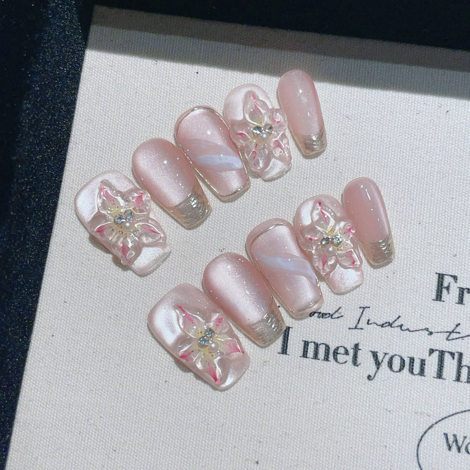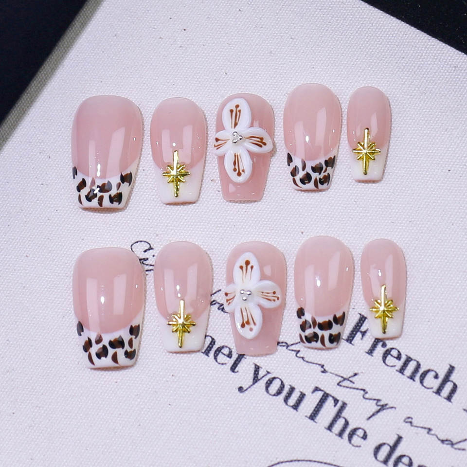 Lot de 10 faux ongles 3D fleuris printemps-été, faits main, en acrylique, à presser, taille moyenne, couvrance totale, avec colle – Vente en gros