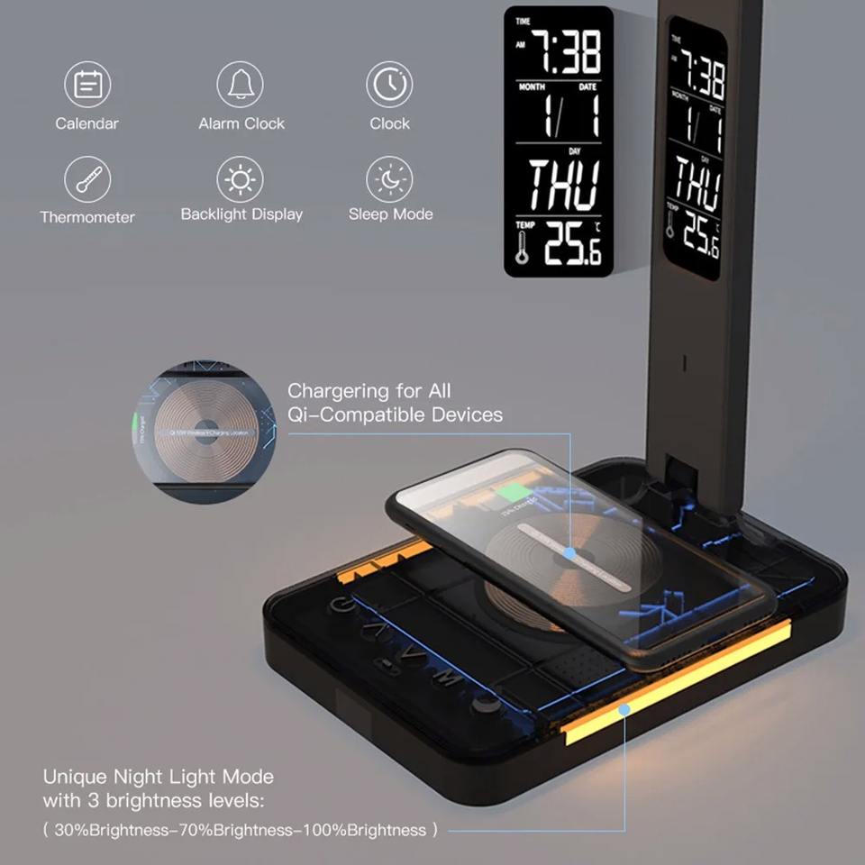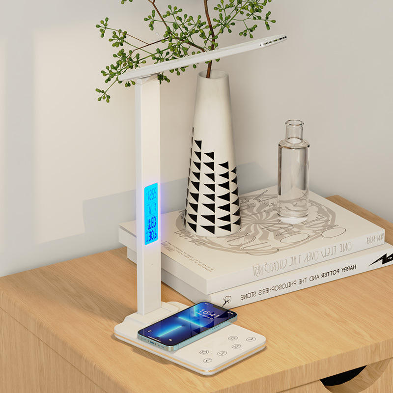 Lampe de bureau LED avec chargeur sans fil QI 10W, veilleuse, calendrier, température, réveil, protection des yeux, lampe de table pour l'étude