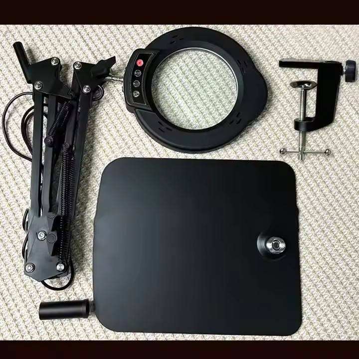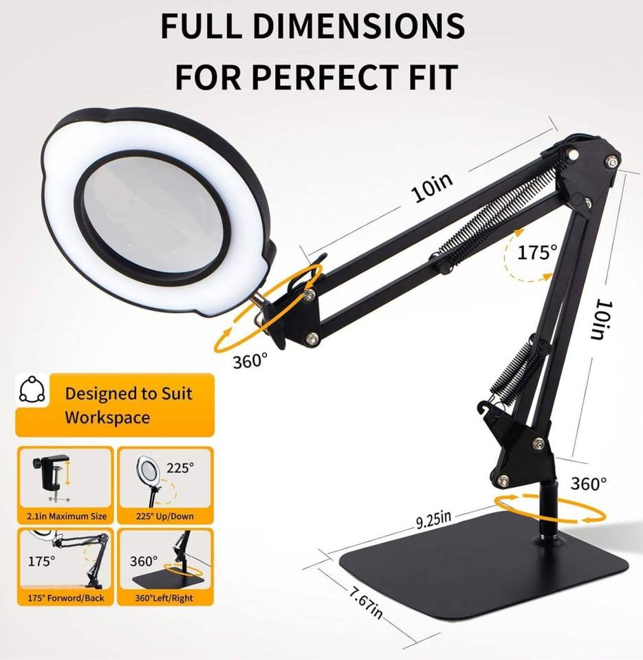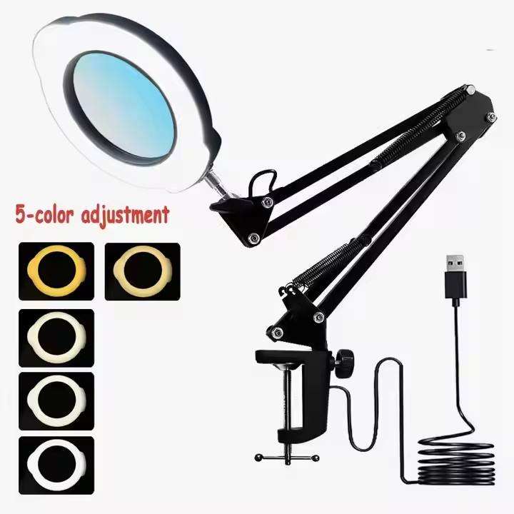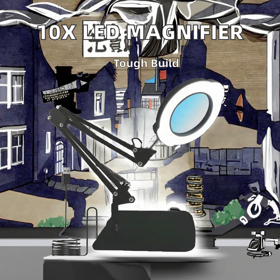 Loupe grossissante 10X avec bras pivotant réglable, 5 modes de couleur, avec pince en fer ou base de table