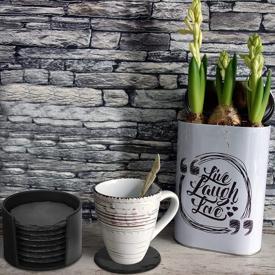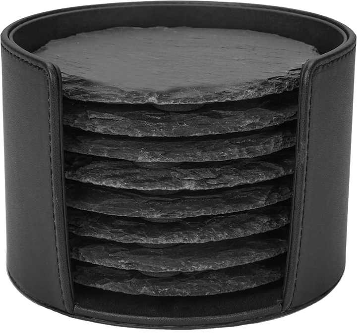 10cm 4 pouces personnalisé rond imprimé blancs marbre noir personnalisé en vrac ardoise pierre sous-verre ensemble avec support en cuir pour boisson