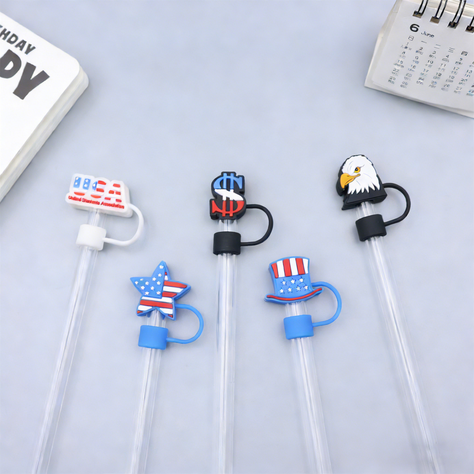 Décorations de pailles patriotiques 3D en PVC souple de 10 mm pour gobelets Stanley - Motifs du 4 juillet et du drapeau américain