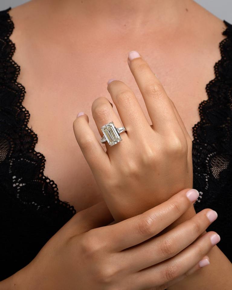 Bague de fiançailles en diamant de laboratoire taille émeraude 11 carats _ Bague trois pierres en platine _ Bague trois pierres en diamant allongé type trilogie