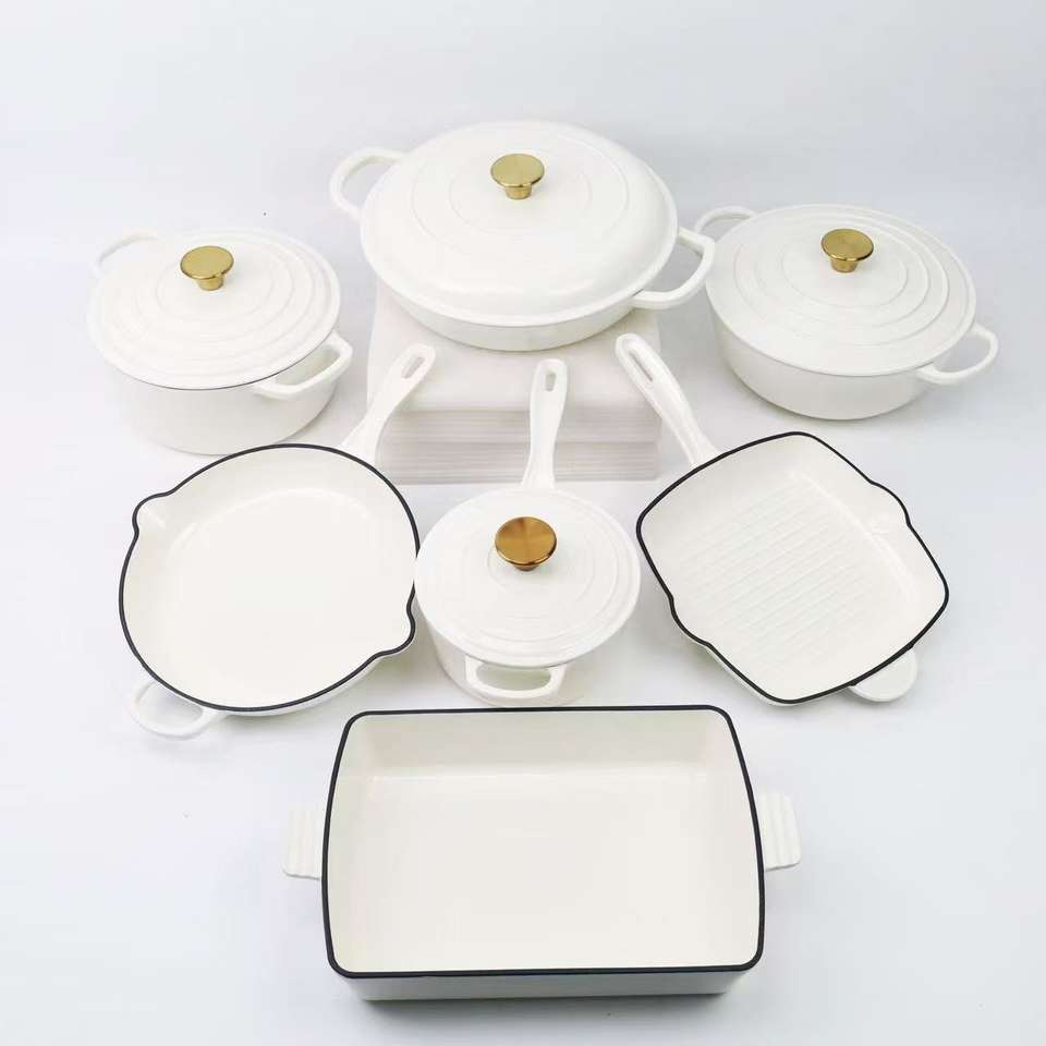 Ensemble de 11 ustensiles de cuisine en fonte émaillée classique, durable, écologique et sain, comprenant une poêle à frire, une cocotte, une marmite et une couvercle, compatible gaz