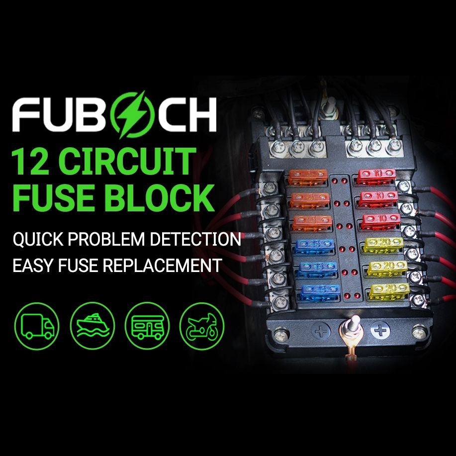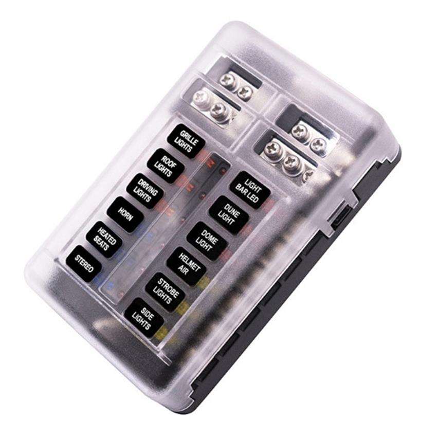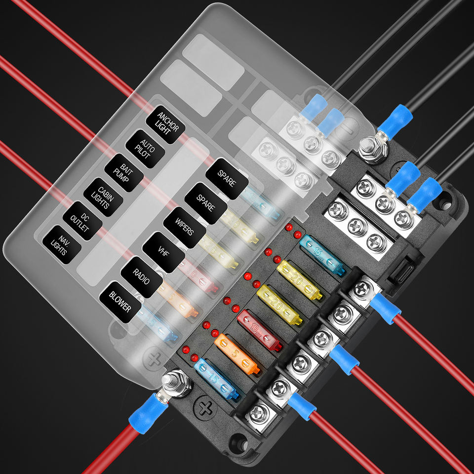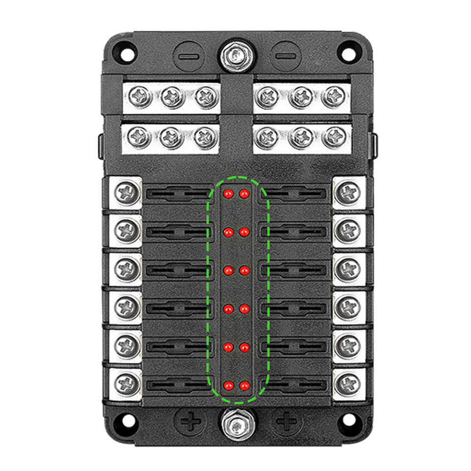 Boîte à fusibles 12 canaux pour voiture, yacht, camping-car/camion avec indicateur LED, pôles positif et négatif, capacité de coupure 10kA, matériau PVC, PCB