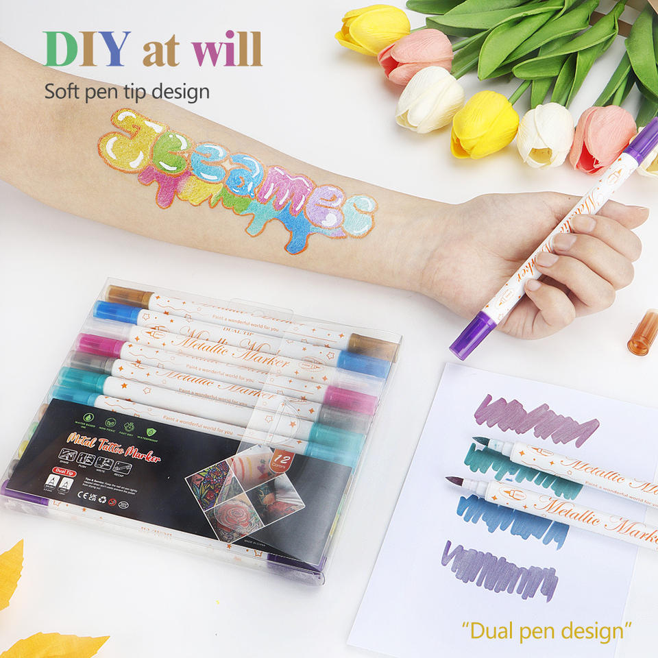 Marqueur permanent 12 couleurs pour peinture faciale, tatouage corporel DIY, stylo double-tête souple et rigide en plastique, crayon marqueur graffiti pour tissu