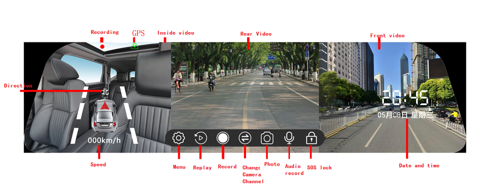 Enregistreur vidéo, CAMÉRA de tableau de BORD, Enregistreur de données d'événement (EDR), Rétroviseur Caméra, Trois objectifsType