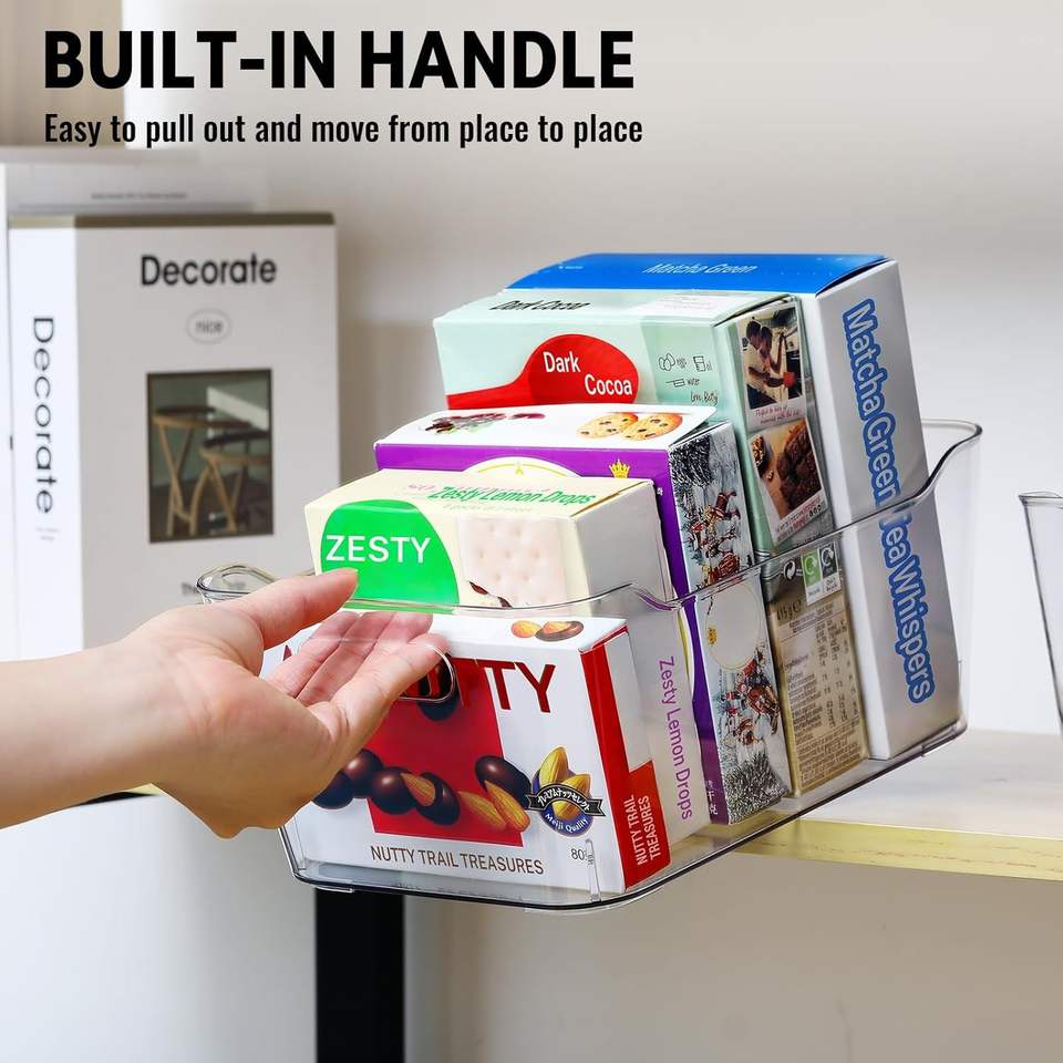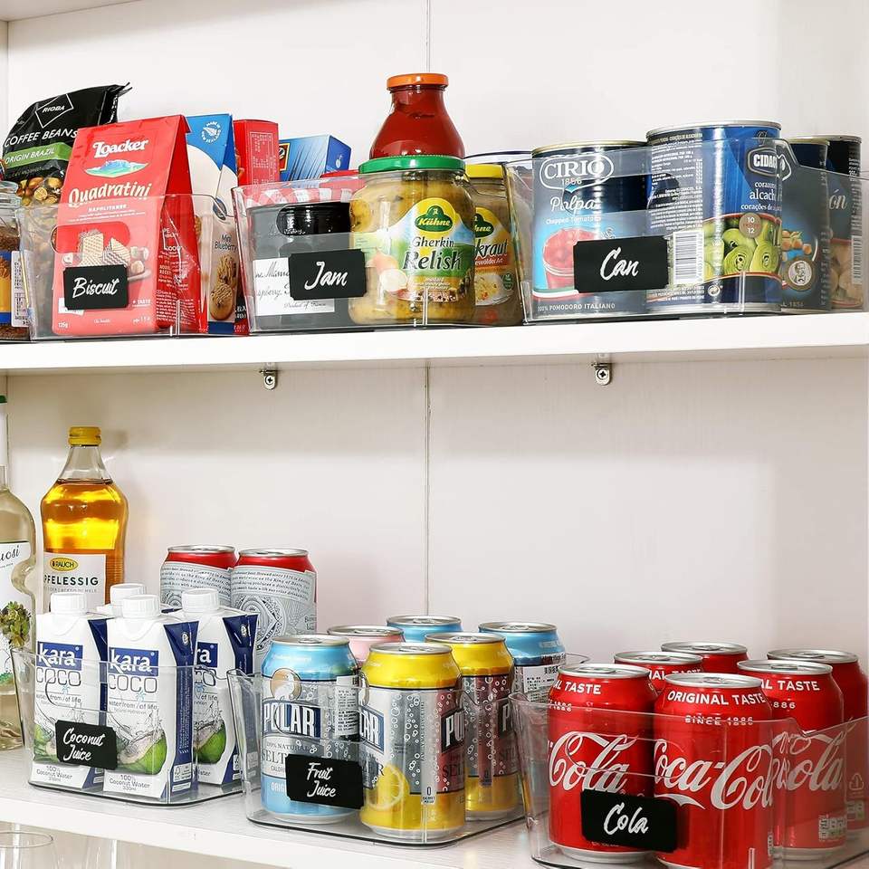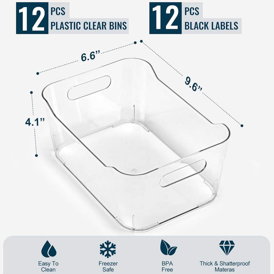 Lot de 12 bacs de rangement en plastique transparent multi-usages avec étiquettes pour l'organisation de la maison, de la cuisine et de la salle de bain