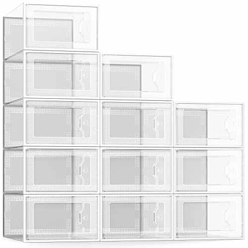 12 paquets gris, bacs à chaussures empilables en plastique transparent avec tiroirs et couvercles, conteneurs de rangement de chaussures sous le lit