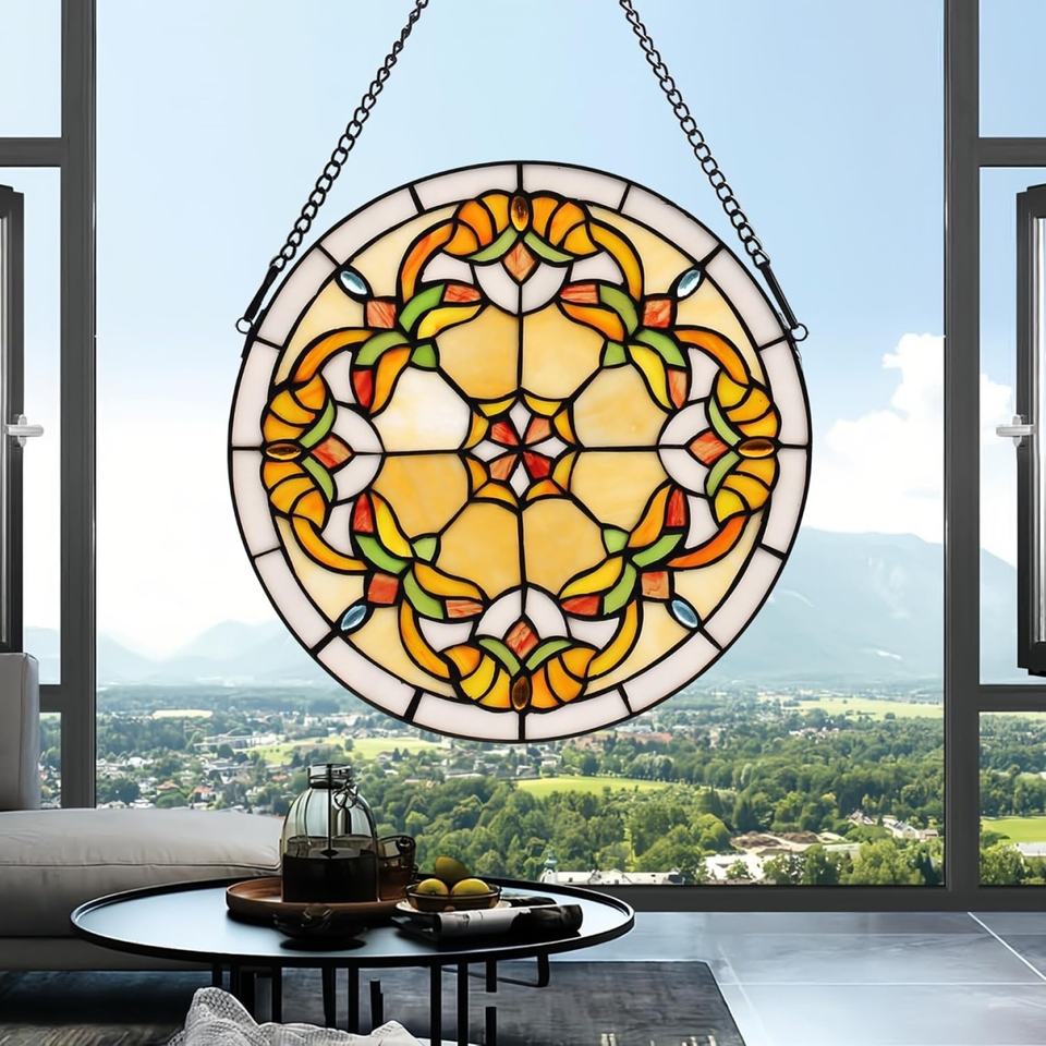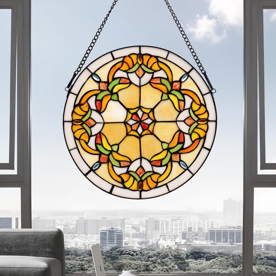 Panneau de fenêtre en verre Tiffany massif de 12 pouces, moderne, abstrait, fait main, plaqué or, écologique, avec crochet à chaîne pour salon