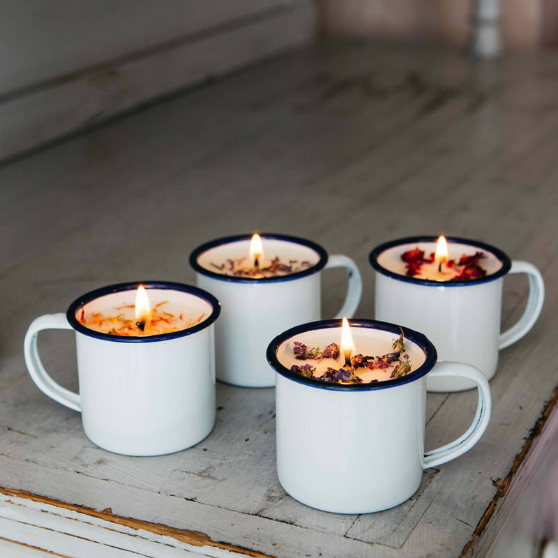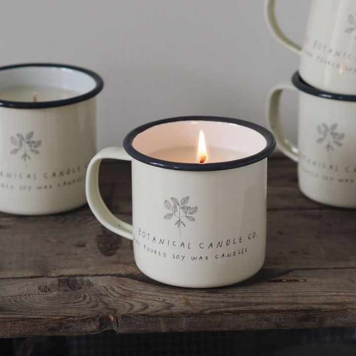 Bougie en cire de soja à bord noir de couleur blanche bon marché avec logo personnalisé tasse de service en émail imprimé pour la maison 12 oz Europe Home