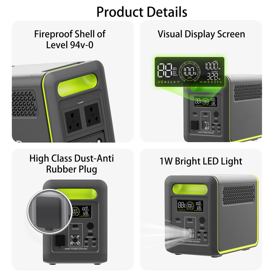 Générateur solaire portable 1200W pour la maison, le camping, avec sortie AC à onde sinusoïdale pure, batterie externe
