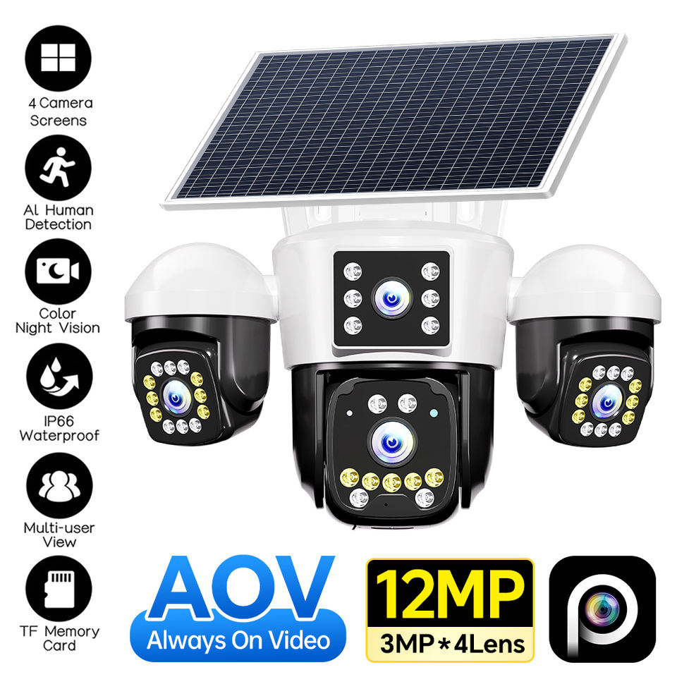 Caméra de sécurité CCTV solaire PTZ 12MP à 4 objectifs et 4 écrans, enregistrement 24/7 AOV, détection humaine IA, IP66 pour ferme/terrain de chantier